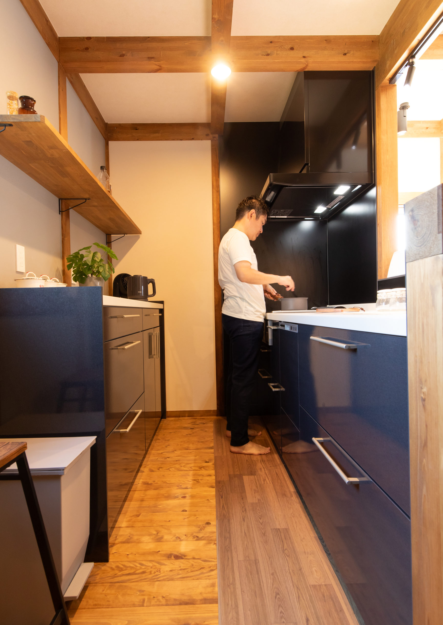 ダークウォルナット×ホワイトが調和したナチュラルモダンなLDKは、ほっとくつろげる暮らしの中心。ブラック×ネイビー×ホワイトの配色がおしゃれなキッチンで、自炊もはかどります。ダイニングを兼ねた造作のL字型カウンターは、まるでカフェのような居心地。毎日の食卓に特別感をプラスします。大きな窓越しに愛車を眺めながらの晩酌が、日々の楽しみなのだそう。