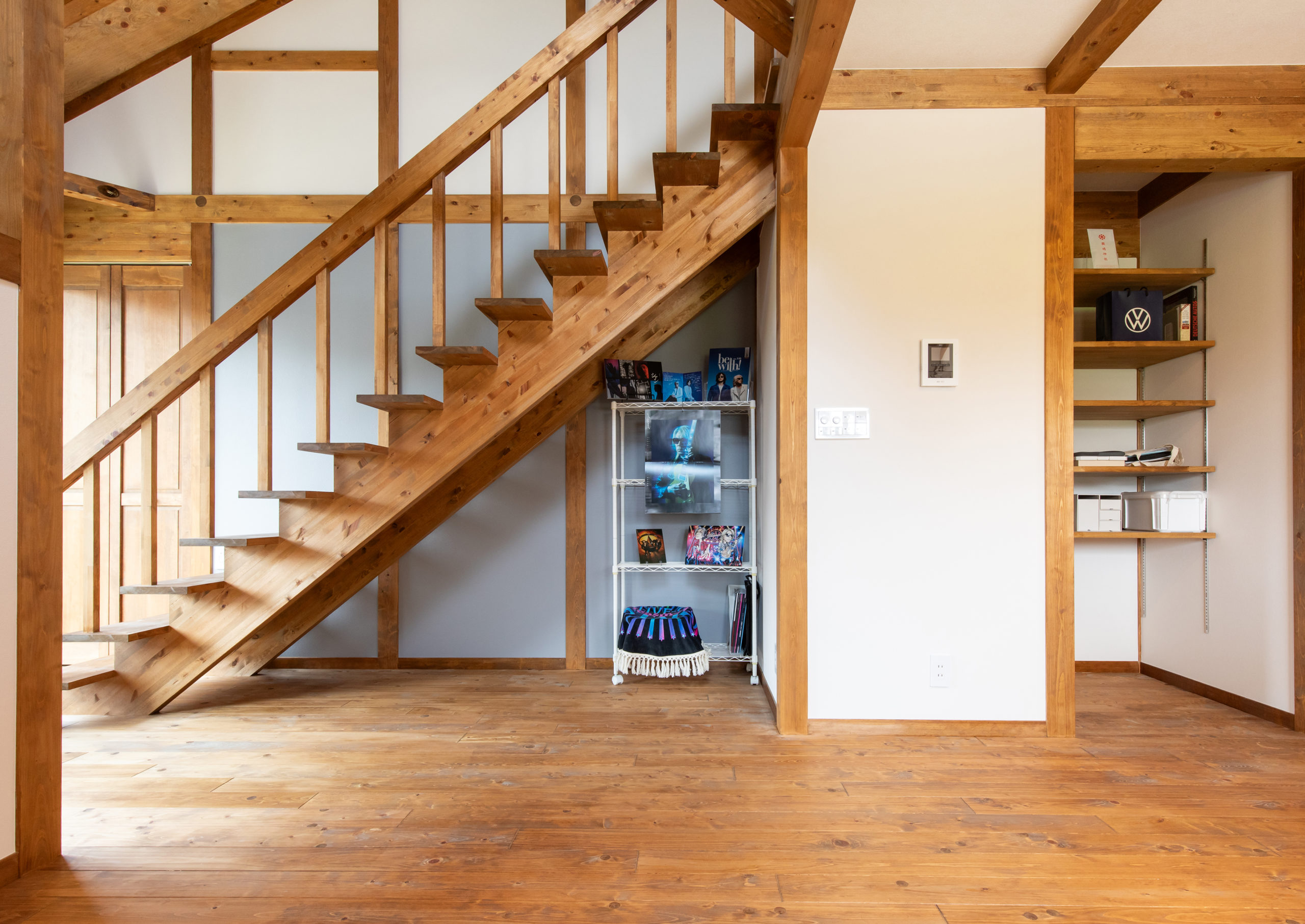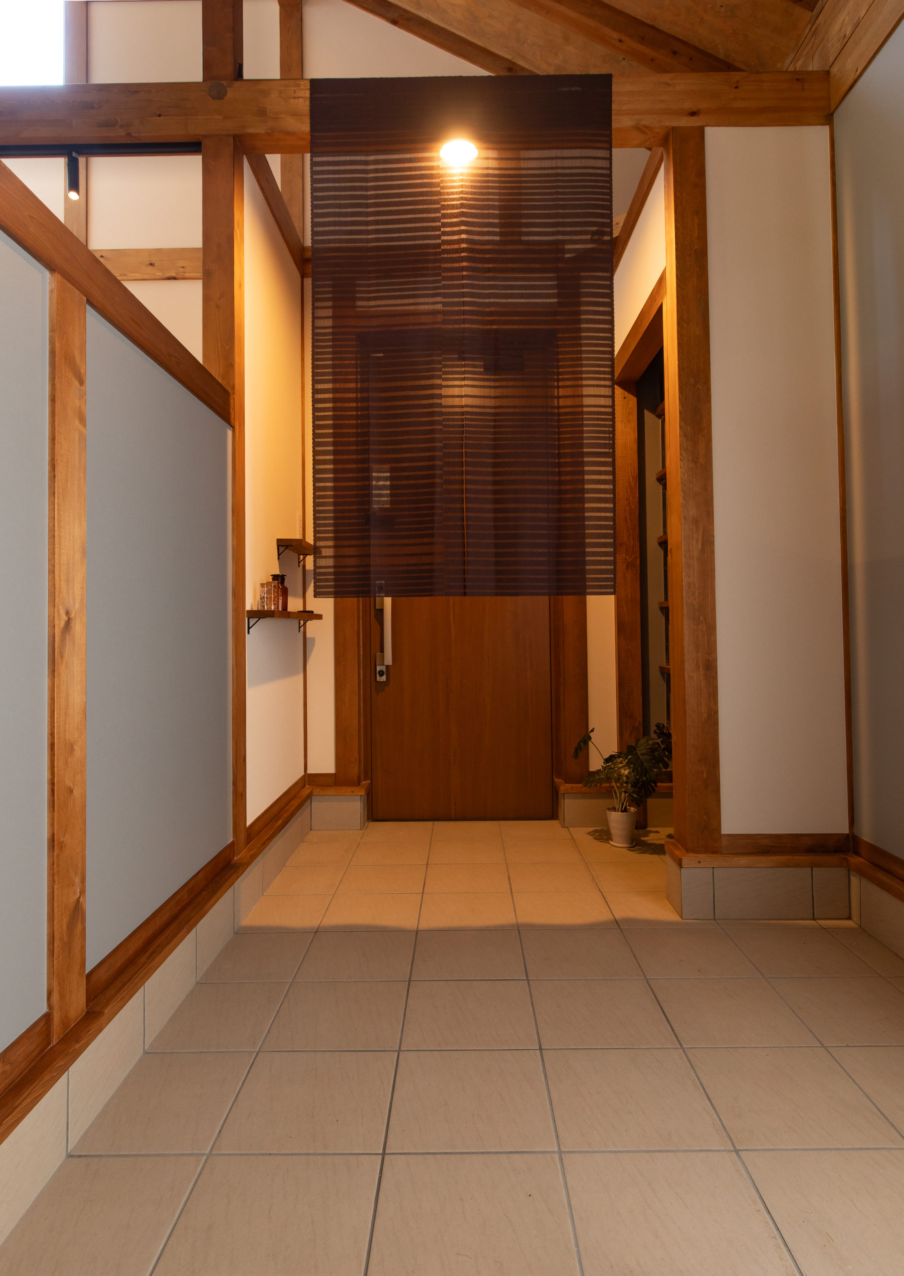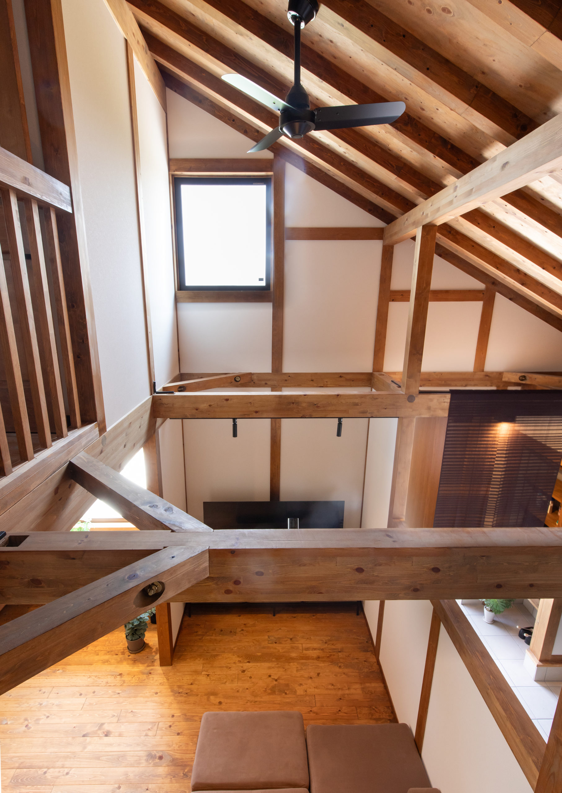 「秘密基地」をテーマにしたYさんの家づくり。やわらかなベージュに深みのある赤が映える、かわいらしい佇まいのひのきの家が完成。玄関ドアを開けると、視線が抜ける開放的な空間が広がります。吹き抜けを見上げれば、真壁づくりならではのダイナミックな木組みが力強い存在感を放ちます。